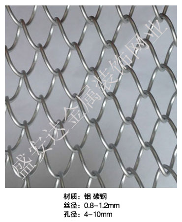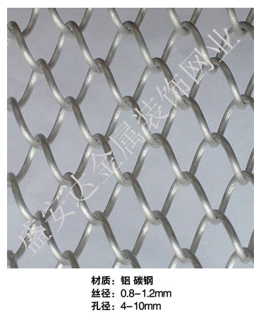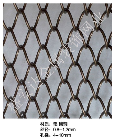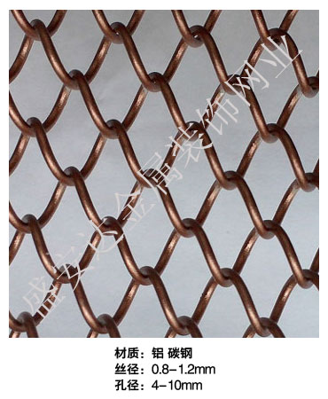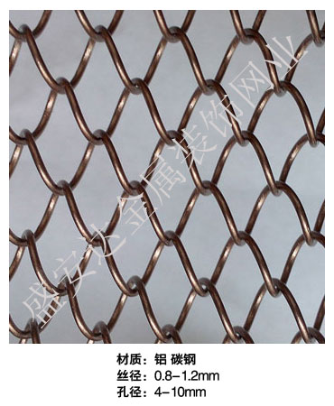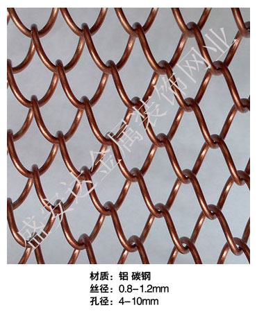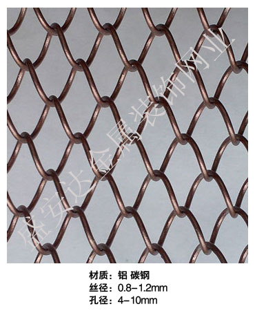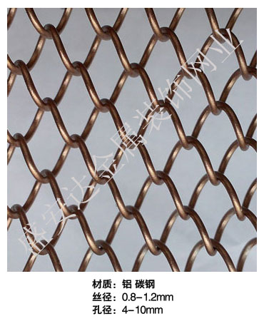 金屬網(wǎng)簾----是一種新型建筑裝飾材料,采用優(yōu)質(zhì)不銹鋼,鋁合金等合金材料,經(jīng)過(guò)特殊工藝編制而成,被賦予了傳統(tǒng)布簾所不具有的的折光效果,讓它具有了動(dòng)感時(shí)尚的特點(diǎn),再加上它的金屬質(zhì)感的特點(diǎn),給您的居室頓感典雅氣質(zhì)非凡個(gè)性高貴品位,會(huì)使高檔賓館,餐廳,歌劇院,展廳變的富麗堂皇。